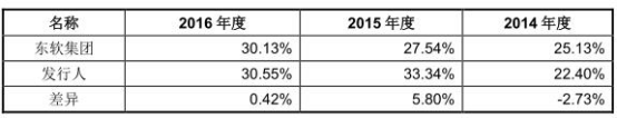 2015 年、2016 年公司烟草领域产品毛利率高于东软集团水平,而 2014 年公司烟草领域产品毛利率较东软集团低 2.73 个百分点,主要是由于公司 2014 年烟草领域业务收入增幅较大,部分新增项目如河南中烟工业有限公司郑州和新郑卷烟厂联合易地技术改造项目(智能化园区监控与管理系统总体集成)、中国烟草总公司四川省公司资源池升级扩容项目规模较大,毛利率相对较低,拉低了当年整体毛利率。
