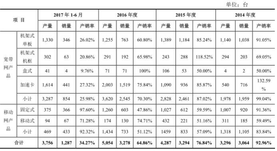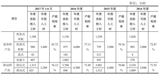 招股书显示,2014-2017年1-6月,公司宽带网产品产能利用率分别为72.87%、70.16%、77.11%、85.72%。移动网产品产能利用率分别71.55%、70.88%、71.05%、76.12%。