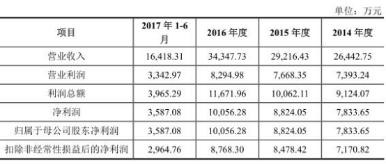 招股书显示,2013-2017年1-6月,公司实现营业收入分别为2.62亿元、2.64亿元、2.92亿元、3.43亿元,1.64亿元。净利润分别为5,725.54万元、7,833.65万元、8,824.05万元、10,056.28万元、3,587.08万元经营活动产生的现金流量净额分别为10,127.86万元、2,555.15万元、10,415.29万元、10,461.38万元、-3,027.87万元。