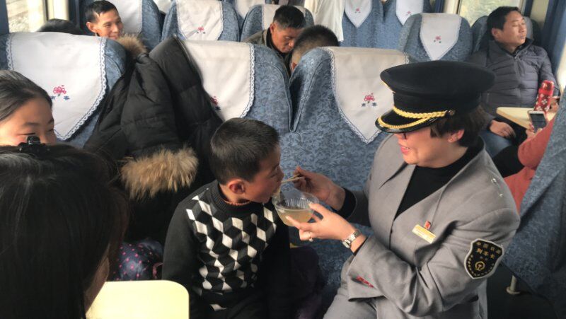 2018年2月9日 ,农历二十四这天 ,正是南方的小年。为让旅客感受温馨春运,南昌铁路局集团公司南昌客运段广深车队担当的九江至深圳的k115次列车第三乘务组工作人员在出乘中和旅客一起欢度小年。车班餐车准备了热腾腾的水饺 ,列车长邓美娟将饺子送到旅客身边。( 赵丹)