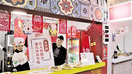 左图 应韩国平昌冬奥组委邀请,受中国文化部派遣,“欢乐春节——行走的年夜饭”活动入驻平昌冬奥会环球集市世界美食文化馆。图为沙县小吃摊位工作人员给人们送祝福。 本报驻首尔记者 白云飞摄