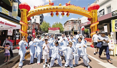 上图 春节期间,澳大利亚珀斯市中华太极拳协会在唐人街表演太极拳。