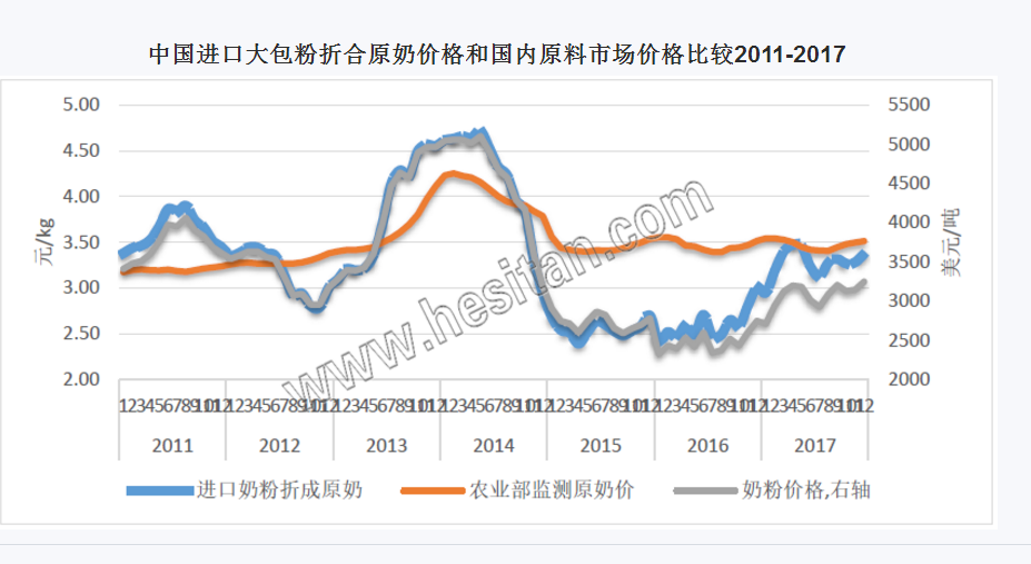 在这一轮原奶危机之中,廉价进口大包粉一直被认为是冲击国内乳业的罪魁祸首之一,进口大包粉本应成为奶源补充,由于国内牛奶的生产成本较高,因此国内部分企业有两套原料方案,在国内牛奶价格较高的时候,用廉价的大包粉来代替生乳。国内对于复原乳使用虽有规范,但在检测上一直缺少标准和手段。2017年国内进口大包粉71.8万吨,同比增长19%。