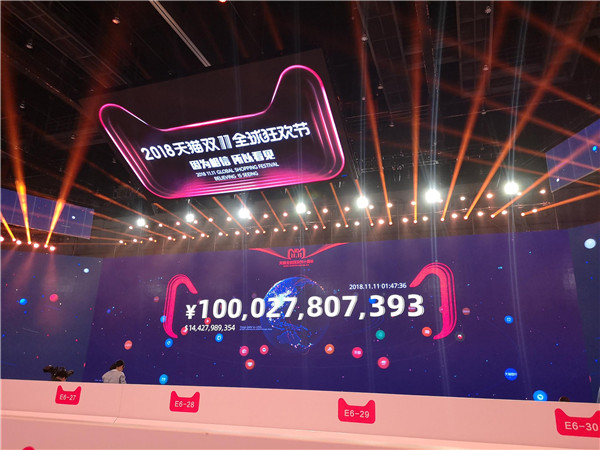 2018天猫双11活动现场,达到1000亿成交额比去年提早7个小时。 央广网记者 梁爽 摄