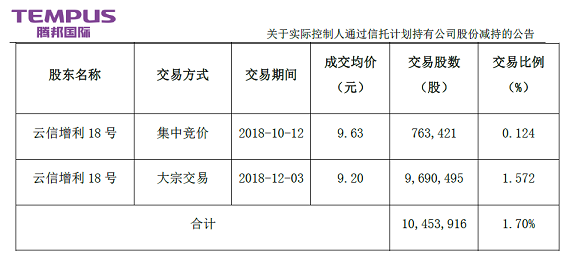 近期,腾邦国际实际控制人钟百胜持有的部分股份被强平。日前,腾邦国际披露,钟百胜通过云南国际信托有限公司-云信增利18号证券投资单一资金信托(以下简称云信增利18号)持有的腾邦国际股份触及信托计划平仓线,被动减持比例累计达公司股份总数的1.7%。这部分被平仓股份成交均价为9.20元/股~9.63元/股,股份数量合计1045.4万股。经计算,这些股份对应减持金额为9649.6万元。该部分持股是钟百胜2017年1月11日~12日增持的股份。