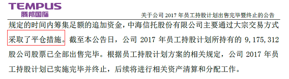同时,腾邦国际的2017年员工持股计划也被强平。受腾邦国际股价下跌影响,员工持股计划在锁定期后触及止损线,因未能在规定时间内筹集足额的追加资金,中海信托股份有限公司采取了平仓措施。该部分员工持股计划涉及被平仓股份为917.5万股。