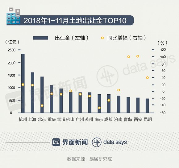 分城市来看,2018年11月,土地出让金最高的城市是杭州,达到2350.2亿元,同比增长19.7%。