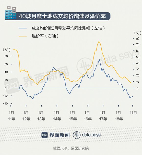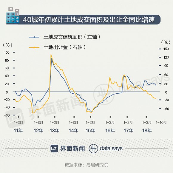 易居研究院数据显示,2018年10月,40城累计土地出让金同比增速在2016年以来首次转负。