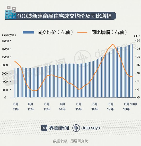 2017年6月,100城房价同比涨幅创下历史新高,达到27.62%。在此后的14个月里,房价同比涨幅不断收窄,直到2018年10月才略有反弹。