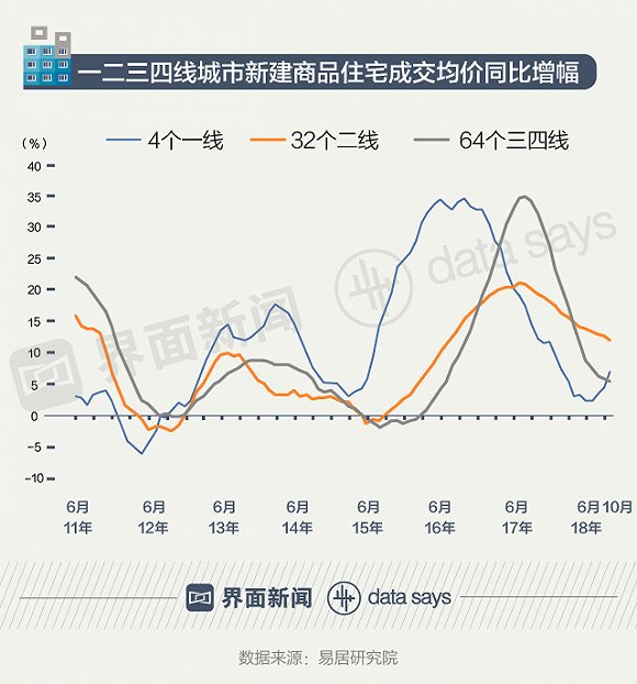 2018年8月,一线城市房价涨幅出现回升的迹象,10月已升至6.95%。