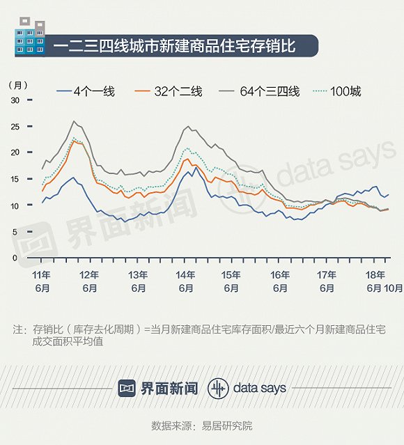 从存销比来看,100城存销比在2018年9月降至历史低位,10月出现小幅反弹。