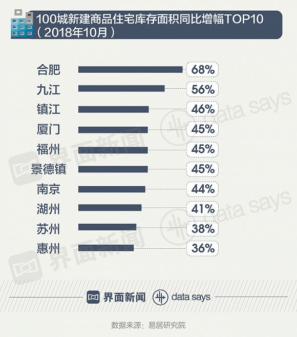 分城市来看,2018年10月,合肥库存同比涨幅最高,近70%;九江次之,达到56%。