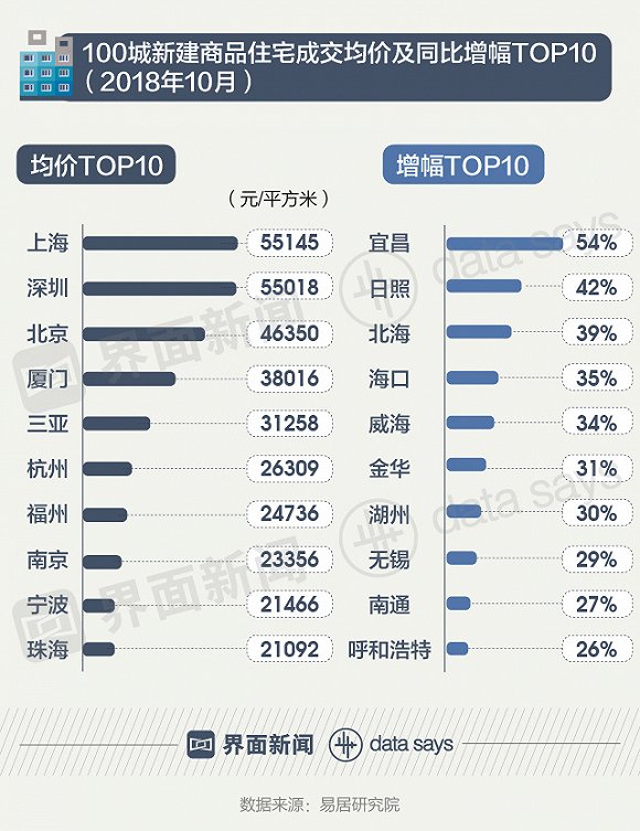分城市来看,2018年10月,上海和深圳房价最高,超过5.5万元/平方米;宜昌房价同比涨幅最高,超过50%。