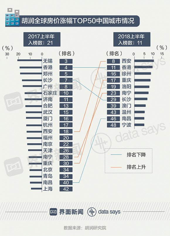 胡润研究院12月6日发布的《2018上半年全球房价指数》显示,在截至2018年6月30日的一年内,全球房价涨幅前50的城市中只有11个中国城市,比去年同期减少10个,北上广三地均跌出榜单。