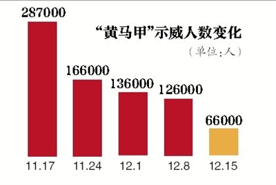 抗议人数比12月8日的12.6万减少了一半,法国政治专家称,主要原因是马克龙周一的电视讲话,以及宣布的一系列减税加薪措施。