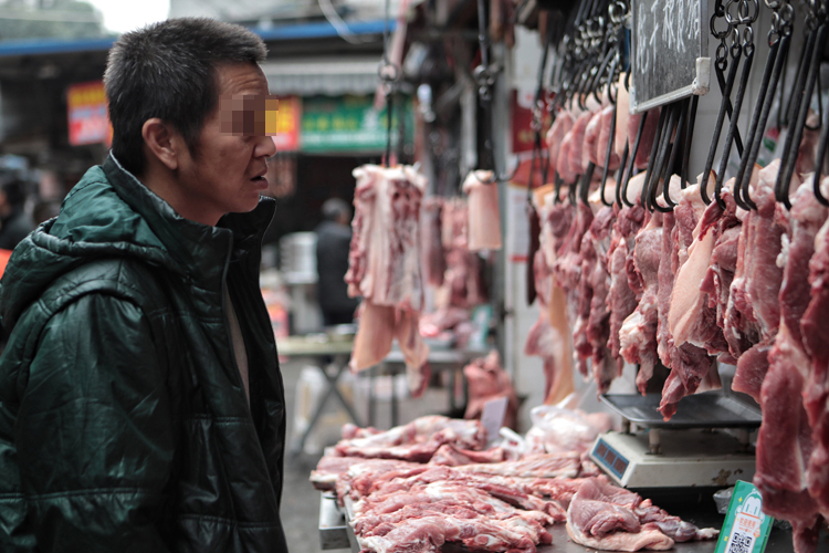 郭安全在菜市场买菜。虽然生活拮据,但在吃这方面要照顾到孩子的营养,也不会吃得太差。