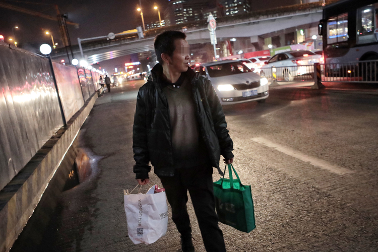 郭安全拿着餐具等物品从医院步行回家。平时,他的妻子负责在医院陪伴女儿,他则负责工作,买菜,做饭,送饭。