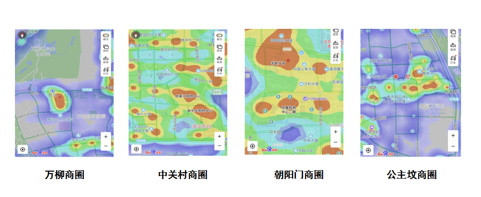 从百度地图提供的热力图(热力图是利用获取的手机基站定位该区域的用户数量,通过用户数量渲染地图颜色)数据看,同样证明了公主坟商圈的人流呈现狭长分布,对比北京其他知名商圈的热力图可以看出,多数商圈确实呈现了“圈”状分布。