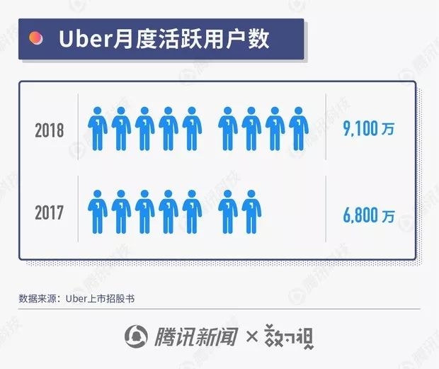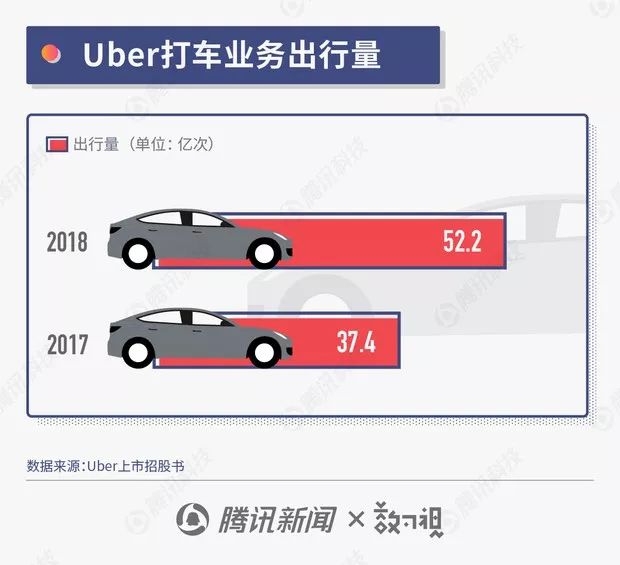 Uber提交的上市招股书显示,2018年Uber的月度活跃用户数已达9100万,较前一年增长了2300万。2018年的打车业务量也增长迅速,共出行52.2亿次,2017年出行量为37.4亿次。