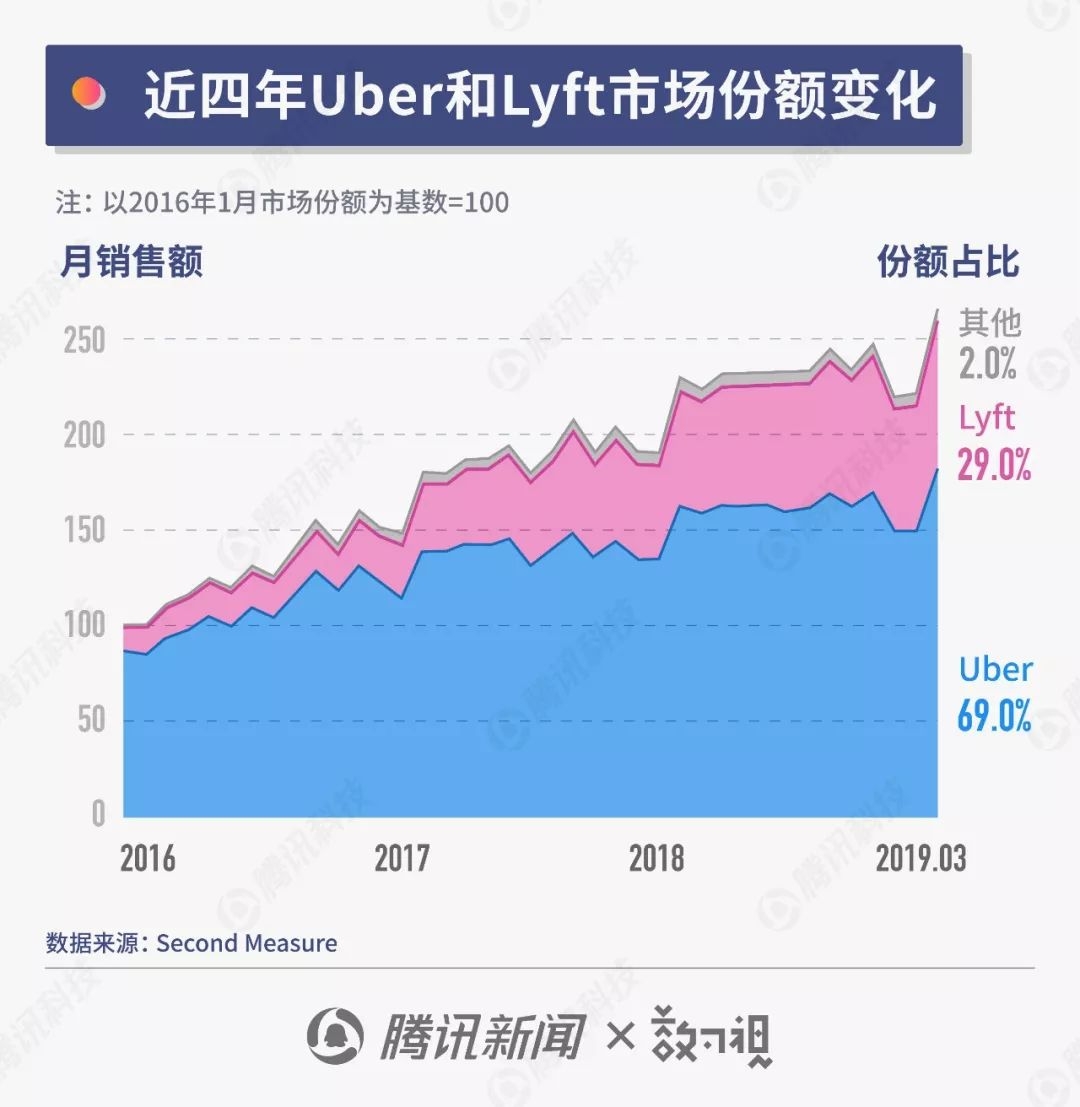 在美国网约车市场上,Uber也占据了绝对的优势。截止今年三月,Uber在网约车行业的占比高达69%,份额超出Lyft达40个百分点。在此之前,Uber的份额也一直处于市场领先地位。