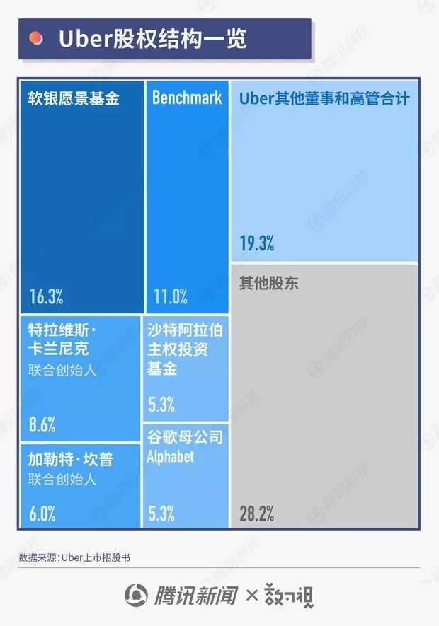 Uber的股权结构主要由八大部分组成。其中,软银远景基金占比达16.3%,联合创始人特拉维斯·卡兰尼克股权占比8.6%,卡勒特·坎普占比6%。谷歌母公司Alphabet占比5.3%。
