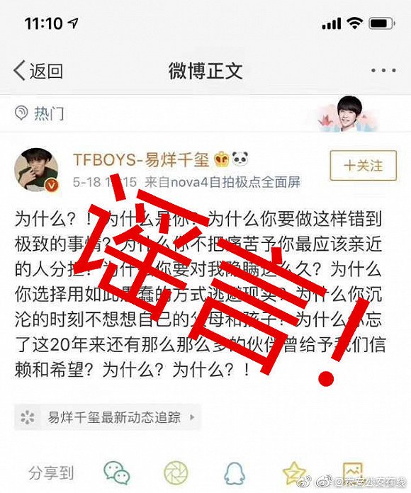 据六安公安在线官方微博辟谣,接网友举报,经警方核实,网上散布的普法先锋易同学@TFBOYS-易烊千玺 发布的#王源抽烟#声明为网友PS所成,所述内容为其它事件内容,警方提示:传播、制造谣言属于违法行为!