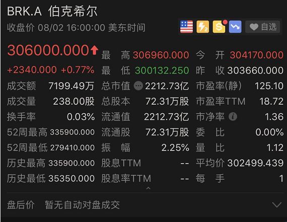 市场方面,截至昨日收盘,伯克希尔哈撒韦股价上涨0.77%,报30.6万美元,其伯克希尔哈撒韦成为全球最贵股价,而其A、B股市值也已突破4900亿美元,跻身全球前五大市值企业队列。