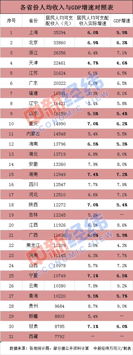 中新经纬客户端梳理发现,2019年上半年,上海、北京、天津、山东、重庆、海南、湖南、陕西、广西、宁夏、青海、甘肃等12省份居民人均可支配收入的实际增速超过了当地的GDP增速。其中青海人均可支配收入实际增速比GDP高了3.8个百分点,陕西人均可支配收入实际增速比GDP高了1.6个百分点。