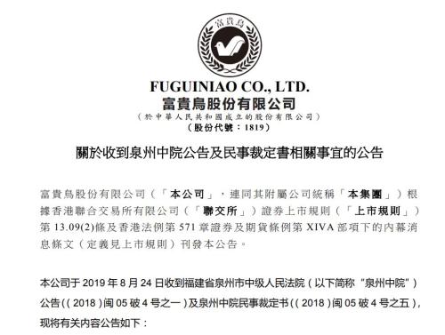 今年8月12日,富贵鸟发布公告称,2019年8月9日,香港联交所向公司发来函件,告知公司股份的最后上市日期将为2019年8月23日,而公司上市地位将于2019年8月26日上午9时起取消。
