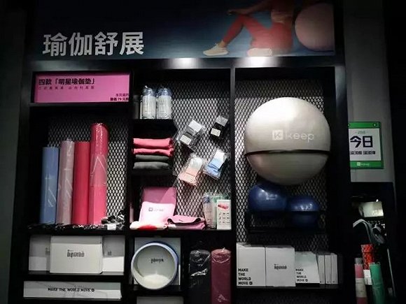 110 平米的店面划分为室内训练、户外运动、瑜伽等主题货架,满满当当塞下了 Keep 线上商城的绝大多数产品。如果不是亲眼见到这些跑步机、运动服、粉色瑜伽垫、浸塑哑铃和Line熊头体脂整理排列,你很难发现 Keep 已经有这么多商品。