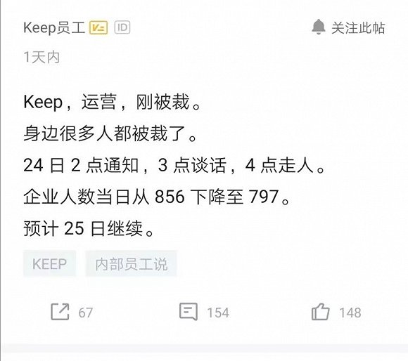 某职场社交平台认证为Keep 员工的用户称:“24 日 2 点通知,3 点谈话,4 点走人。企业人数当日从 856 下降至 797。”