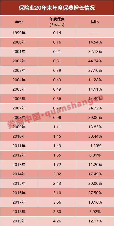 2019年,中国保险业的年度保费突破4万亿,全年原保险保费收入已达4.26万亿元,同比增长12.2%。