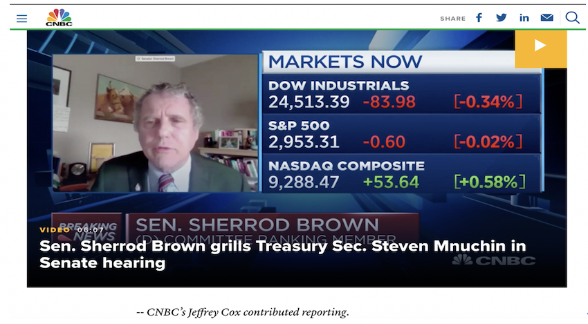 △美国消费者新闻与商业频道报道,民主党领袖谢罗德·布朗指责姆努钦在听证会上的表现没有诚意