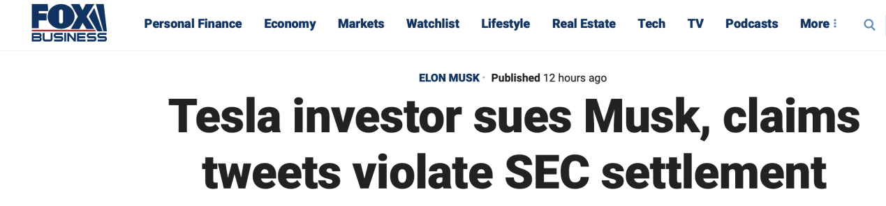 福克斯报道截图据报道,诉讼中还特意挑出了几条马斯克的“高光推特”,例如去年5月1日,马斯克曾发推说特斯拉的股价“太高了”,结果特斯拉市值暴跌130亿。