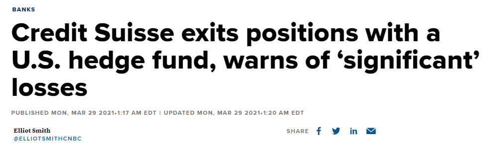 瑞士信贷(Credit Suisse)表示:「一家大型的美国对冲基金未履行瑞士信贷和某些其他银行上周发出的追加保证金要求,在基金未能履行这些保证金承诺之后,瑞士信贷和许多其他银行正在退出这些头寸。」
