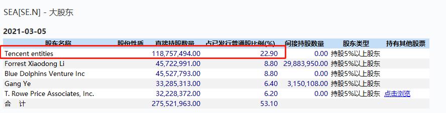 2017年,公司从初创时期的Garena更名为现在的Sea,当年10月在纽交所挂牌上市,腾讯握有超3成股份为最大股东。