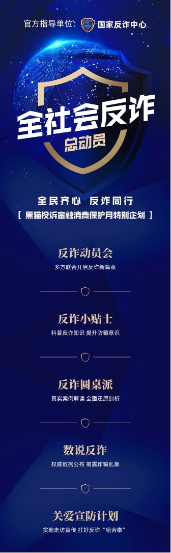 随着互联网技术的迅猛发展,各类新型诈骗手段层出不穷,严重扰乱社会治安稳定,影响人民群众的财产乃至社会稳定。为打击、防范电信网络诈骗,维护社会的长治久安,在国家反诈中心的指导下,新浪旗下消费者服务平台黑猫投诉开启“全民齐心 反诈同行”主题系列活动。通过动员全社会反诈、全方位科普防诈骗知识、真实案例曝光、数据化分析、线下互动活动等系列活动,强化大众防诈识诈的意识和能力,更广泛地调动社会各方力量参与到打击整治电信诈骗的行动中。