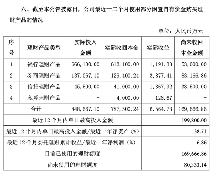 公告显示,迎驾贡酒近12个月委托理财累计收益占其最近一年净利润6.86%,理财实际取得的收益6564万元,其实际投入的金额则高达84.9亿元。