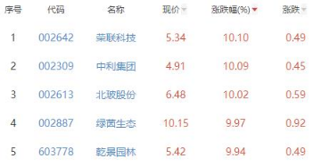 其中,荣联科技、中利集团、北玻股份、绿茵生态、乾景园林位列板块涨幅前五位,涨幅分别为10.10%、10.09%、10.02%、9.97%、9.94%。