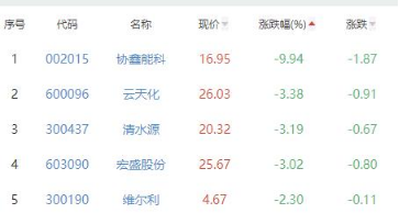 协鑫能科、云天化、清水源、宏盛股份、维尔利位列涨幅榜后五位,涨幅分别为-9.94%、-3.38%、-3.19%、-3.02%和-2.30%。