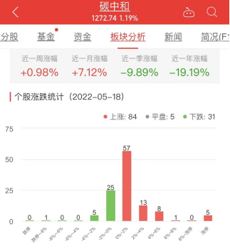 中国经济网北京5月18日讯 今日,碳中和板块整体涨幅1.19%,其中84只股票上涨,5只股票平盘,31只股票下跌。