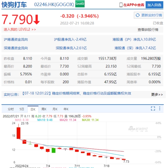 中国经济网北京7月21日讯 今日,快狗打车(02246.HK)股价下跌,盘中最低报7.73港元,创新低。截至港股收盘,该股报7.79港元,跌幅-3.946%,港股市值47.95亿港元。
