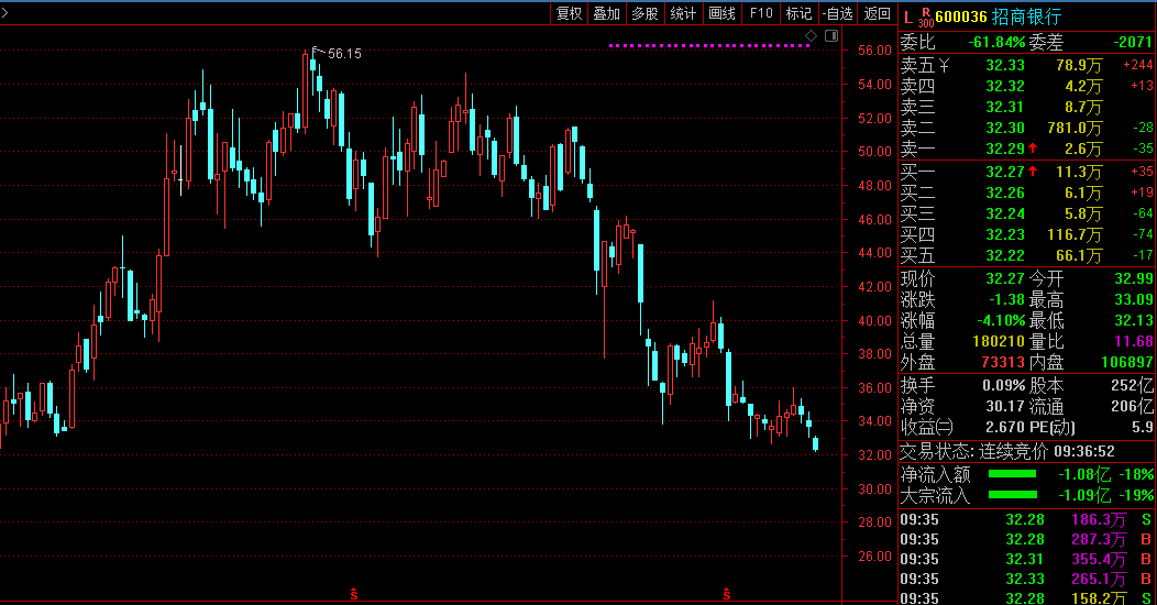 10月10日开盘,招商银行领跌银行股。截至发稿报32.27元,跌4.10%,股价创出自2020年7月份以来新低。