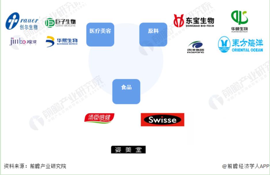 目前,中国胶原蛋白龙头企业主要集中在胶原蛋白原料、医疗健康用胶原蛋白产品和胶原蛋白食品三大领域。