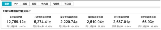 Wind资讯统计数据显示,截至2022年10月9日,A股市场包含IPO、增发和配股等多种方式在内的全口径募资家数共677起,股权融资总金额为12762.62亿元,较去年同期下降约2%,但已经超过了2018年全年。