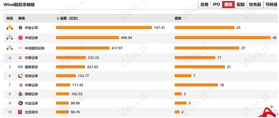 增发榜上,中金公司超过中信证券,以737.41亿元承销金额排名第一。第二、第三分别是中信证券和中信建投。而增发的前十名榜单中,还包括了瑞银证券、北京高华两家外资投行。