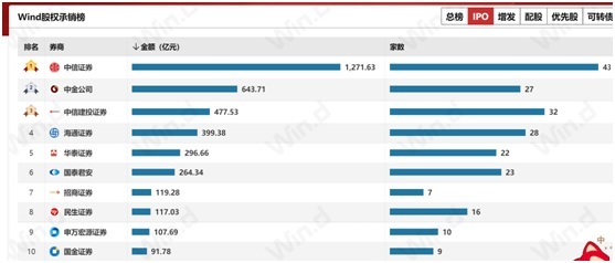 Wind资讯统计数据显示,IPO榜单中,中信证券以1271亿元的总承销金额名列第一;中金公司紧随其后,IPO承销金额达到643.71亿元。中信建投以477.53亿元排名第三。海通证券、华泰联合、国泰君安、招商证券、民生证券、申万宏源、国金证券分列第四到第十名。
