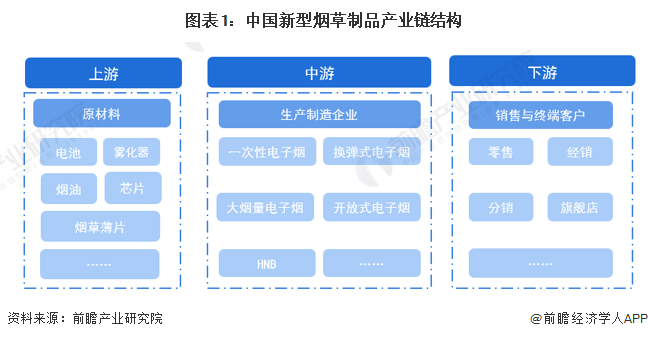 新型烟草制品产业链的上游是原材料供应商,包括了芯片、电子烟壳体等原材料的供应;中游则是电子烟行业的主要参与者——设备制造商和品牌商等,以及加热不燃烧烟草制品的制造商;下游主体则是各代理商、分销商、经销商和终端消费者。