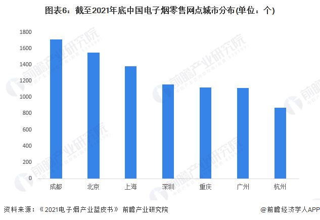 成都市是我国各城市中电子烟零售网点数量最多的城市,共有1712个电子烟零售网点。其次是北京市的1547个和上海市的1384个。位于零售网点分布最多省份广东省的深圳市排名第四,2021年末共有1157个电子烟零售网点。