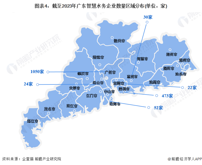 地区分布方面,目前广东智慧水务企业主要分布在广州和深圳等地,截至2023年1月4日,广州共有相关智慧水务企业数1050家,深圳则有473家。